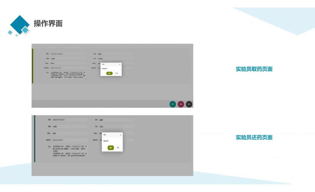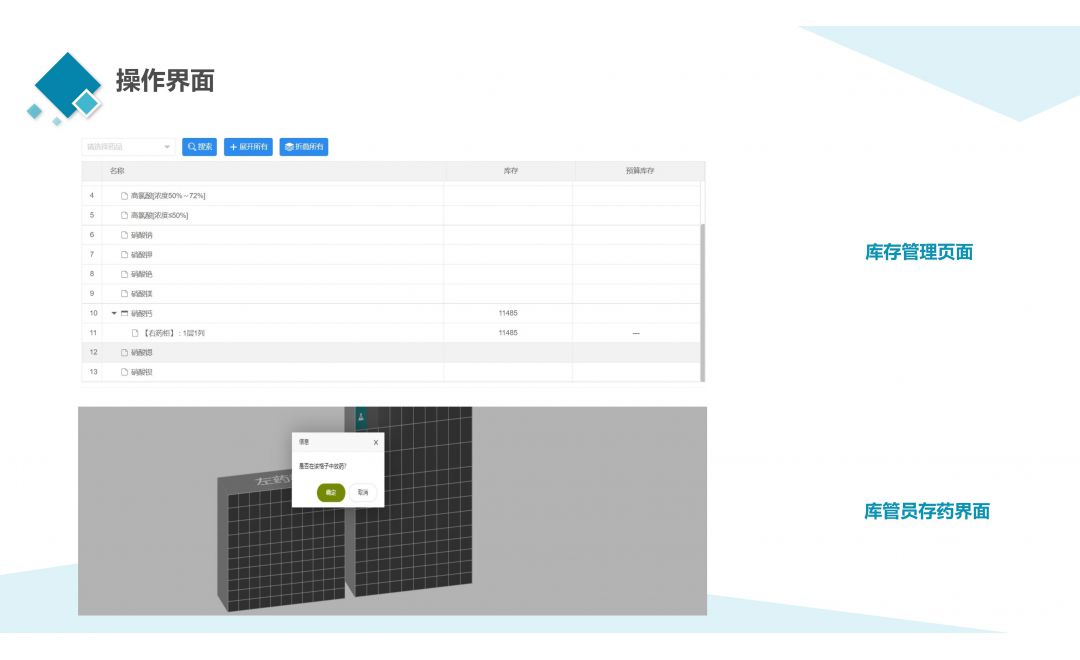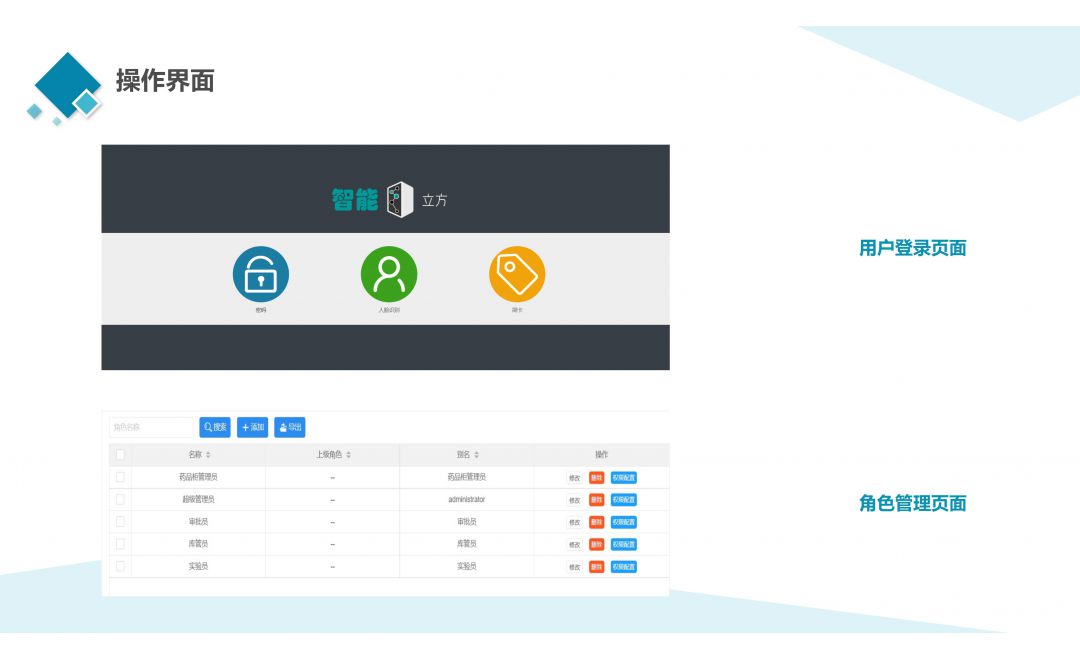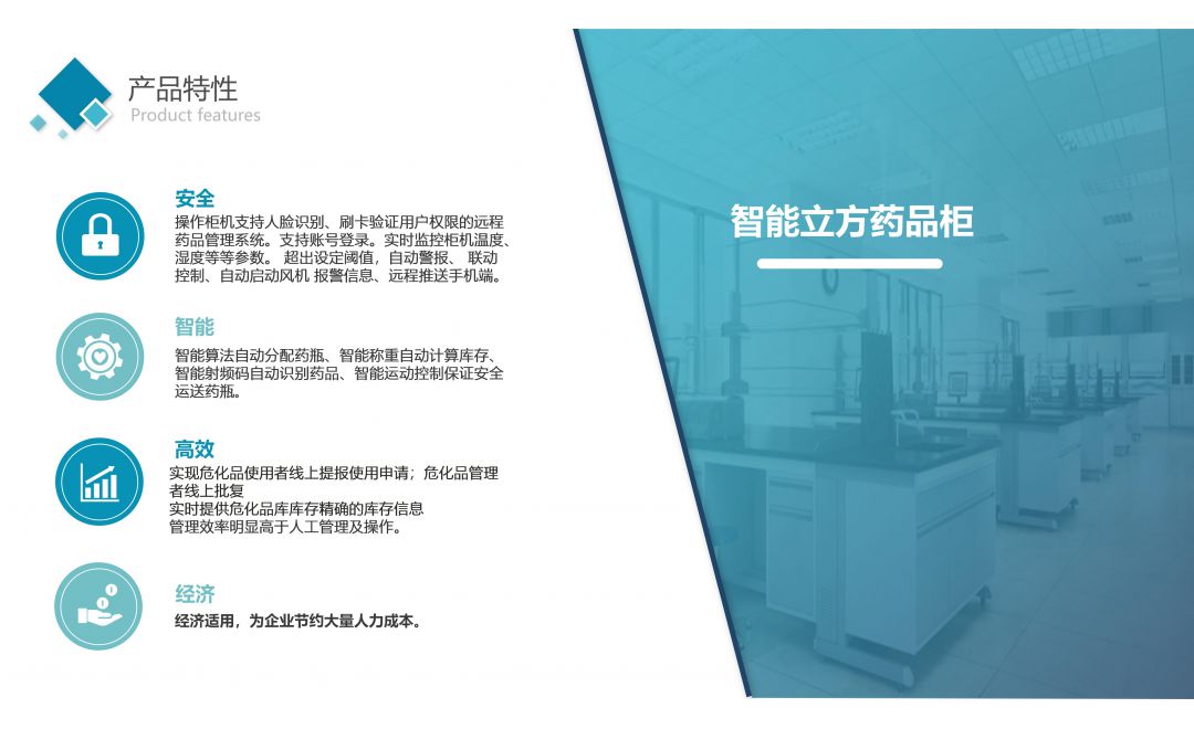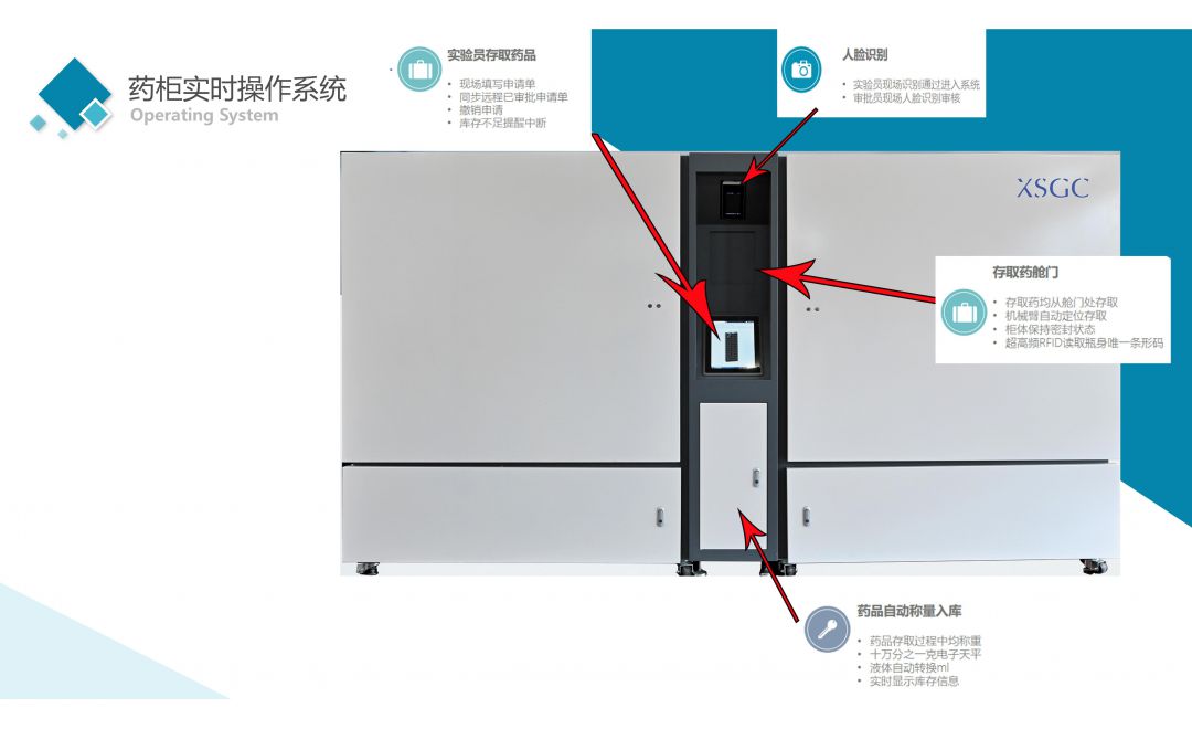 以人工智能技术为支撑,实现自动定位、自动识别试剂出入库状态,存取记录自动保存,一键导出,便捷存取的试剂安全柜。 操作药品柜的人员可使用人脸、刷卡、密码登录三种方式进入药品柜操作系统,后台记录操作日志。 危化品库使用全过程中,除危化品首次入库、补货及清空报废三个必须危化品管理员参与的环节外,其他使用环节真正意义上在无人工干预的情况下实现智能化发放、记录、回收,完全避免人为错误及干预而出现的不必要问题。 利用RFID无线射频,对每一支试剂进行精准定位并自动识别试剂,帮助用户快速找到每一支试剂。 取还试剂自动称重,试剂柜内温湿度自动记录,自动通风。自动灭灭装置